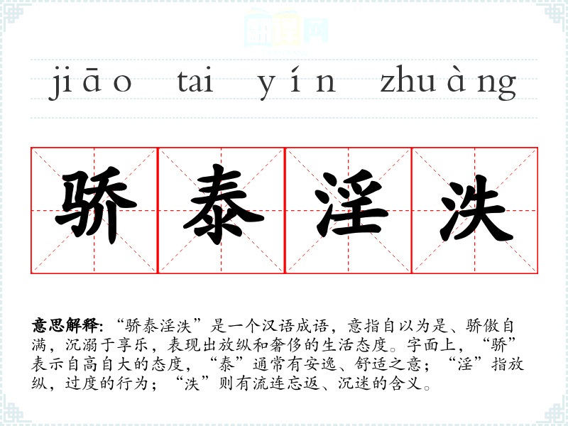 “骄泰淫泆”是一个汉语成语,意指自以为是、骄傲自满,沉溺于享乐,表现出放纵和奢侈的生活态度。字面上,“骄”表示自高自大的态度,“泰”通常有安逸、舒适之意;“淫”指放纵,过度的行为;“泆”则有流连忘返、沉迷的含义。