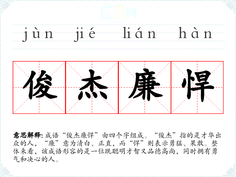 成语“俊杰廉悍”由四个字组成。“俊杰”指的是才华出众的人,“廉”意为清白、正直,而“悍”则表示勇猛、果敢。整体来看,该成语形容的是一位既聪明才智又品德高尚,同时拥有勇气和决心的人。