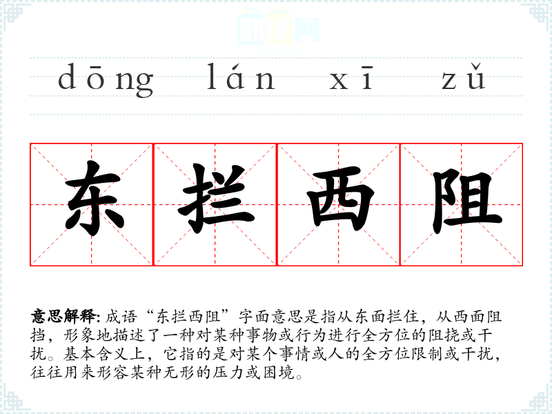 成语“东拦西阻”字面意思是指从东面拦住,从西面阻挡,形象地描述了一种对某种事物或行为进行全方位的阻挠或干扰。基本含义上,它指的是对某个事情或人的全方位限制或干扰,往往用来形容某种无形的压力或困境。
