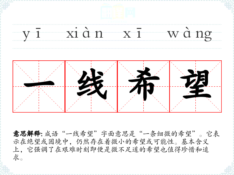 成语“一线希望”字面意思是“一条细微的希望”。它表示在绝望或困境中,仍然存在着微小的希望或可能性。基本含义上,它强调了在艰难时刻即便是微不足道的希望也值得珍惜和追求。
