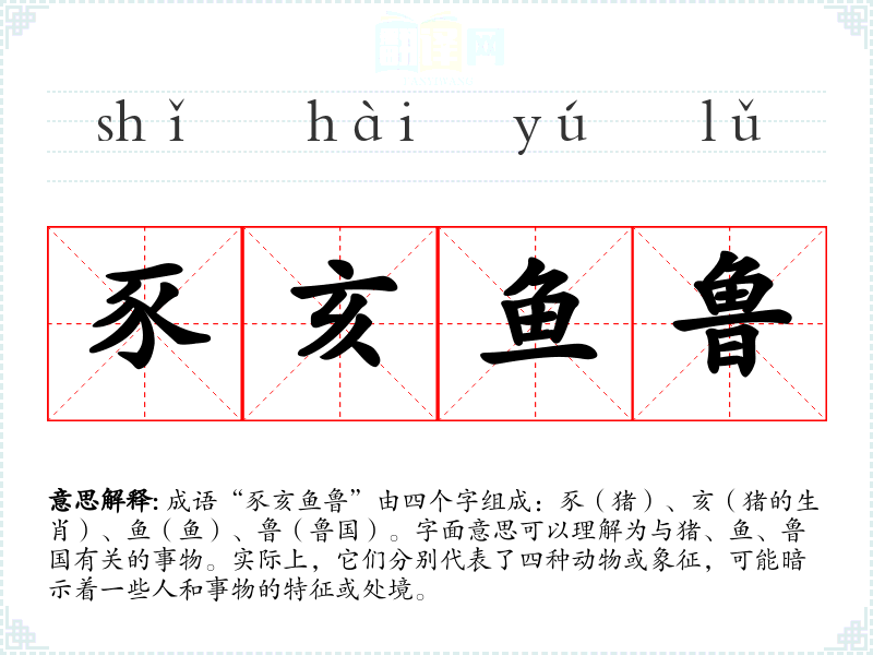 成语“豕亥鱼鲁”由四个字组成:豕(猪)、亥(猪的生肖)、鱼(鱼)、鲁(鲁国)。字面意思可以理解为与猪、鱼、鲁国有关的事物。实际上,它们分别代表了四种动物或象征,可能暗示着一些人和事物的特征或处境。