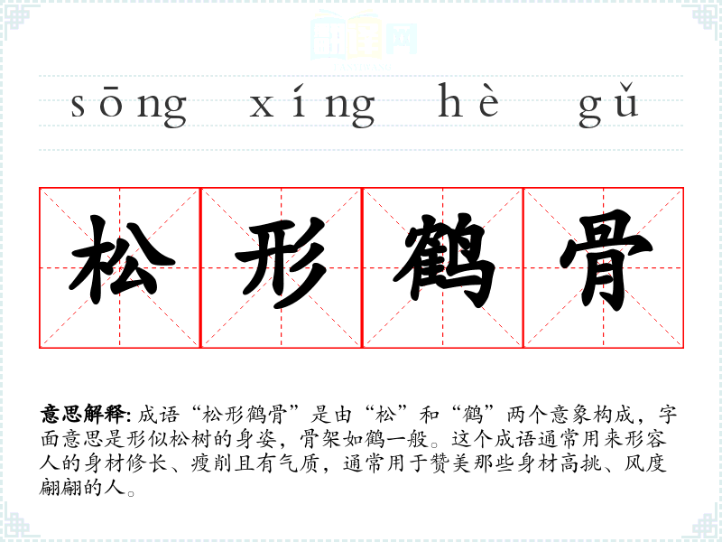 成语“松形鹤骨”是由“松”和“鹤”两个意象构成,字面意思是形似松树的身姿,骨架如鹤一般。这个成语通常用来形容人的身材修长、瘦削且有气质,通常用于赞美那些身材高挑、风度翩翩的人。