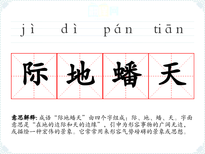 “际地蟠天”出自《庄子·天下》:“天之涯地之角,知交半零落。”这句话表达了人与人之间的情谊和人与自然的关系。成语在后来的文学作品中被多次引用,逐渐演化为形容宏大或无边的状态。