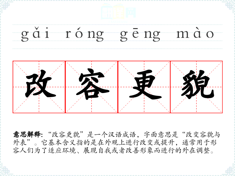 “改容更貌”是一个汉语成语,字面意思是“改变容貌与外表”。它基本含义指的是在外观上进行改变或提升,通常用于形容人们为了适应环境、展现自我或者改善形象而进行的外在调整。
