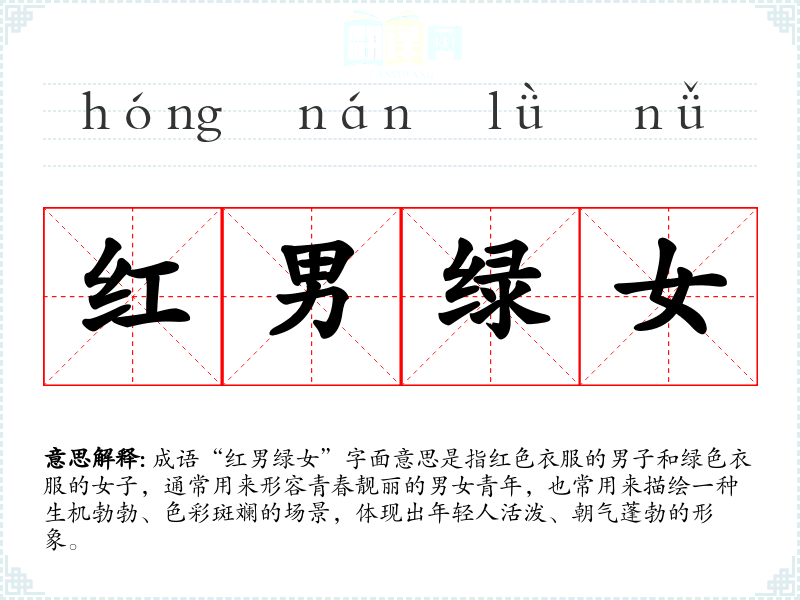 成语“红男绿女”字面意思是指红色衣服的男子和绿色衣服的女子,通常用来形容青春靓丽的男女青年,也常用来描绘一种生机勃勃、色彩斑斓的场景,体现出年轻人活泼、朝气蓬勃的形象。
