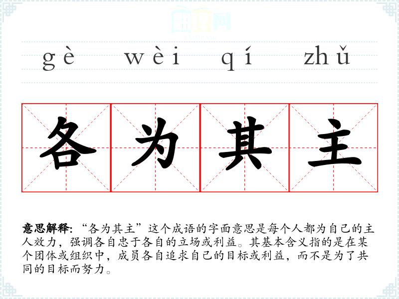 “各为其主”这个成语的字面意思是每个人都为自己的主人效力,强调各自忠于各自的立场或利益。其基本含义指的是在某个团体或组织中,成员各自追求自己的目标或利益,而不是为了共同的目标而努力。
