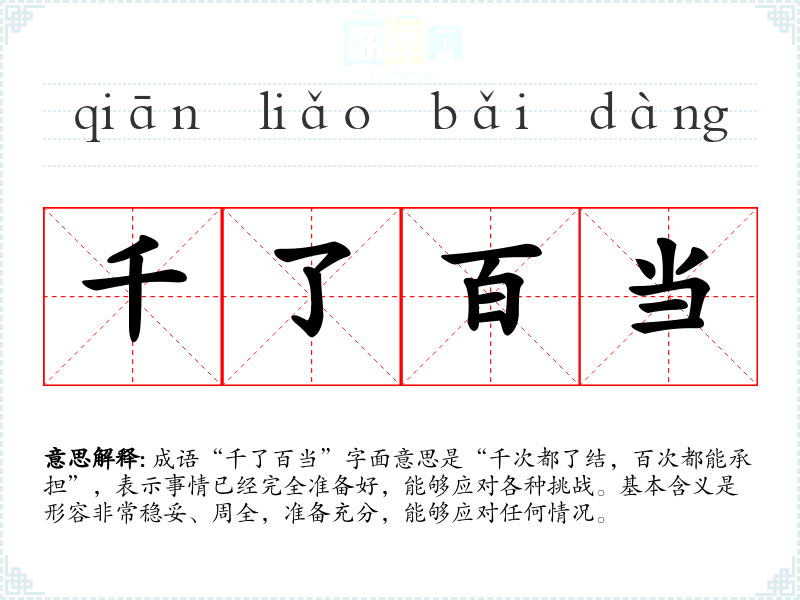 成语“千了百当”字面意思是“千次都了结,百次都能承担”,表示事情已经完全准备好,能够应对各种挑战。基本含义是形容非常稳妥、周全,准备充分,能够应对任何情况。