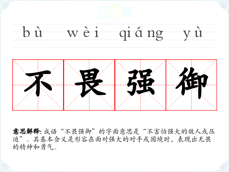 成语“不畏强御”的字面意思是“不害怕强大的敌人或压迫”。其基本含义是形容在面对强大的对手或困境时,表现出无畏的精神和勇气。
