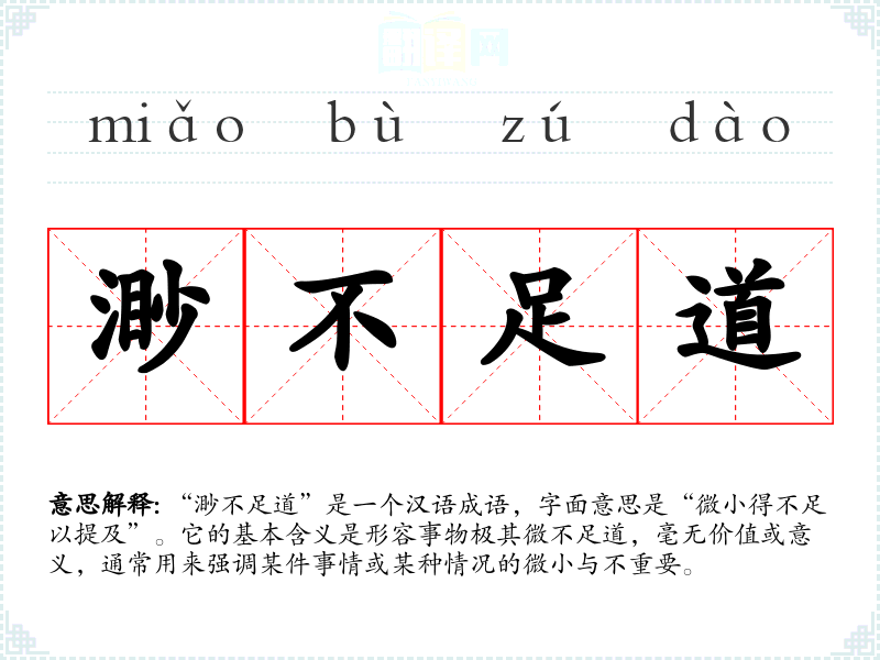 “渺不足道”是一个汉语成语,字面意思是“微小得不足以提及”。它的基本含义是形容事物极其微不足道,毫无价值或意义,通常用来强调某件事情或某种情况的微小与不重要。