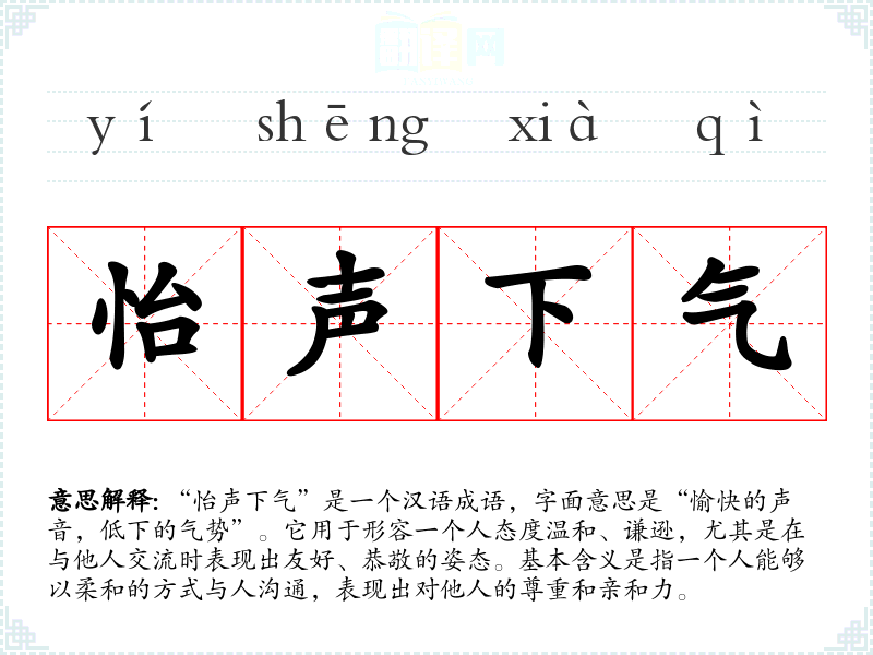 | 怡声下气 | 怡声:声音和悦;下气:态度恭顺。形容声音柔和,态度恭顺。 |