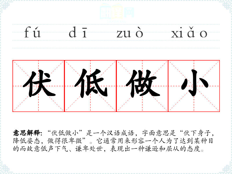 “伏低做小”是一个汉语成语,字面意思是“伏下身子,降低姿态,做得很卑微”。它通常用来形容一个人为了达到某种目的而故意低声下气、谦卑处世,表现出一种谦逊和屈从的态度。