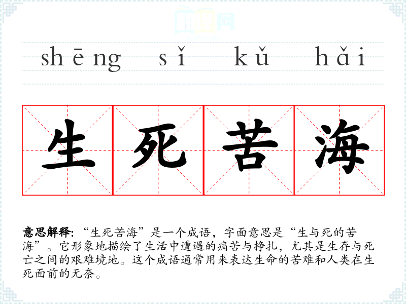 “生死苦海”是一个成语,字面意思是“生与死的苦海”。它形象地描绘了生活中遭遇的痛苦与挣扎,尤其是生存与死亡之间的艰难境地。这个成语通常用来表达生命的苦难和人类在生死面前的无奈。