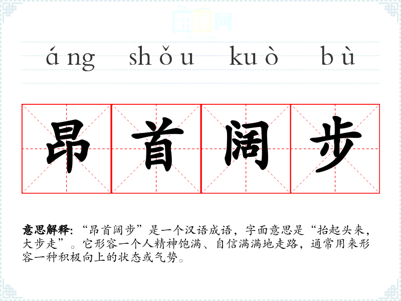 “昂首阔步”是一个汉语成语,字面意思是“抬起头来,大步走”。它形容一个人精神饱满、自信满满地走路,通常用来形容一种积极向上的状态或气势。