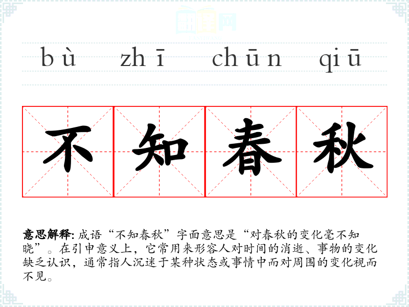 成语“不知春秋”字面意思是“对春秋的变化毫不知晓”。在引申意义上,它常用来形容人对时间的消逝、事物的变化缺乏认识,通常指人沉迷于某种状态或事情中而对周围的变化视而不见。