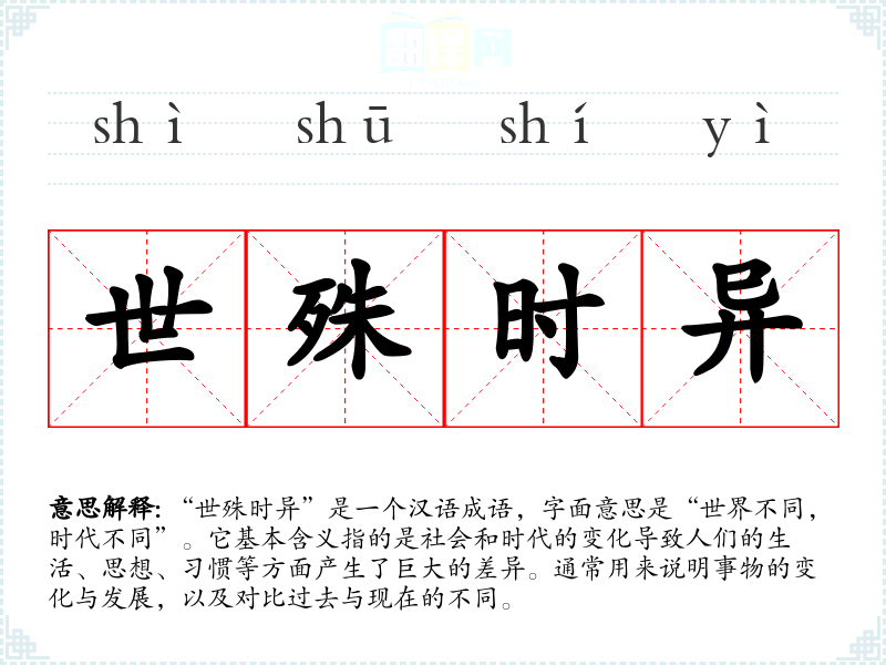 | 世殊时异 | 世、时:时代;殊、异:不同,差异。指时代不同了。 |