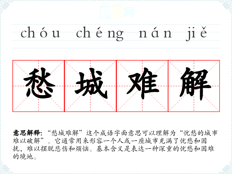 “愁城难解”这个成语字面意思可以理解为“忧愁的城市难以破解”。它通常用来形容一个人或一座城市充满了忧愁和困扰,难以摆脱悲伤和烦恼。基本含义是表达一种深重的忧愁和困难的境地。