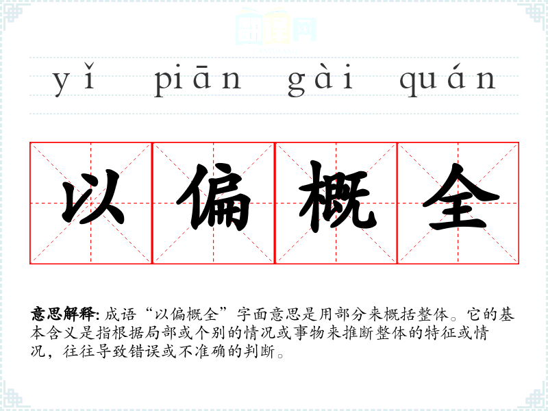 成语“以偏概全”字面意思是用部分来概括整体。它的基本含义是指根据局部或个别的情况或事物来推断整体的特征或情况,往往导致错误或不准确的判断。