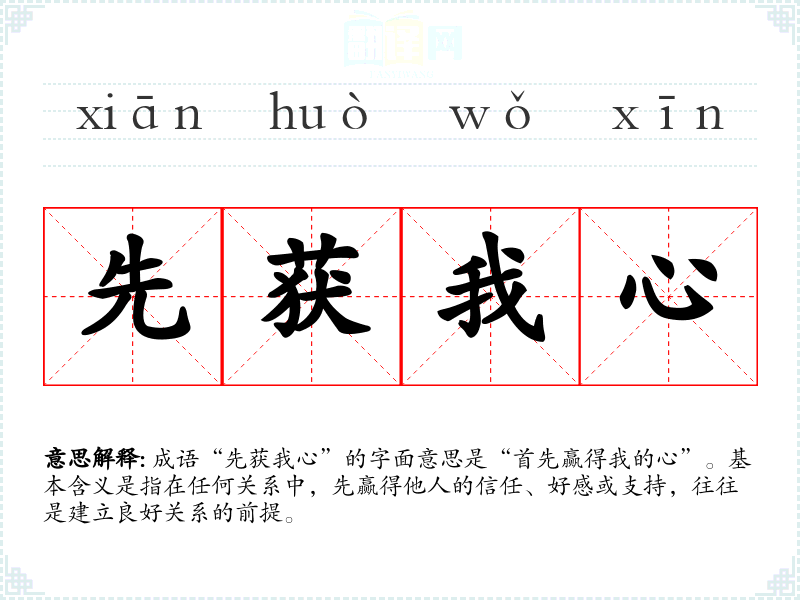 成语“先获我心”的字面意思是“首先赢得我的心”。基本含义是指在任何关系中,先赢得他人的信任、好感或支持,往往是建立良好关系的前提。