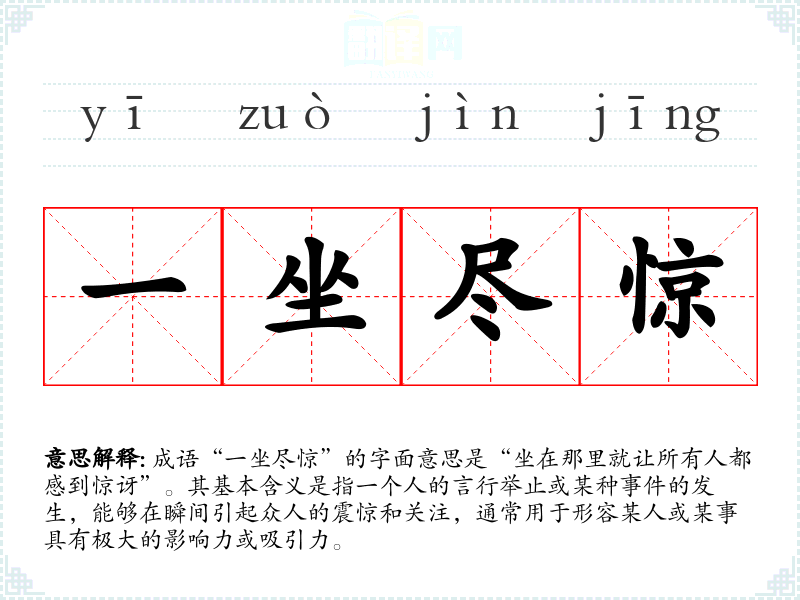 成语“一坐尽惊”的字面意思是“坐在那里就让所有人都感到惊讶”。其基本含义是指一个人的言行举止或某种**的发生,能够在瞬间引起众人的震惊和关注,通常用于形容某人或某事具有极大的影响力或吸引力。