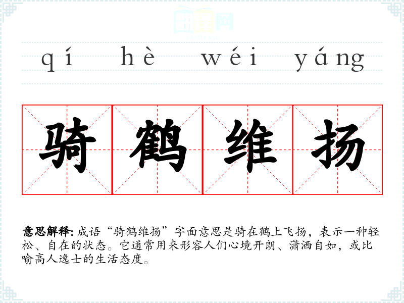 成语“骑鹤维扬”字面意思是骑在鹤上飞扬,表示一种轻松、自在的状态。它通常用来形容人们心境开朗、潇洒自如,或比喻高人逸士的生活态度。