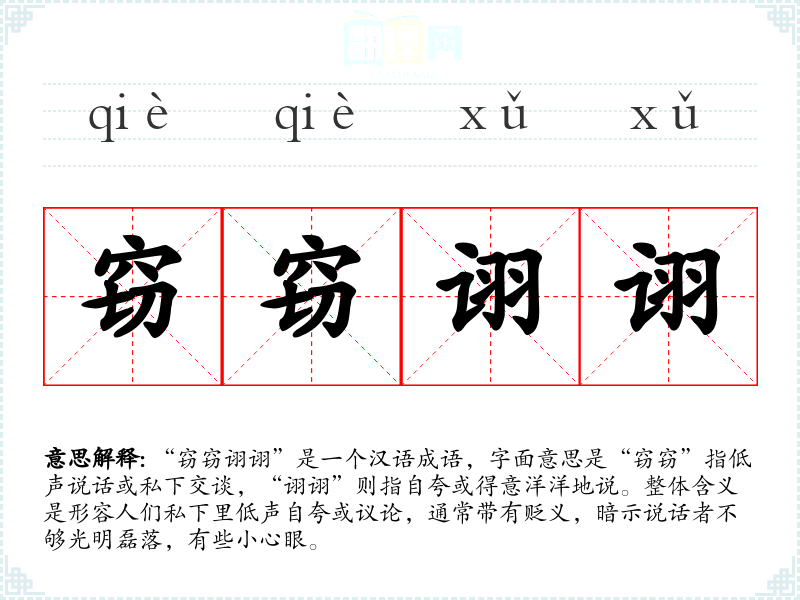 成语“窃窃诩诩”源自《诗经·小雅·采薇》中的“窃窃其言”。其中“窃窃”指低声私语,“诩诩”则是后来的引申,强调自我夸耀。成语在古文中逐渐演变,成为对私下自夸者的形象描述。