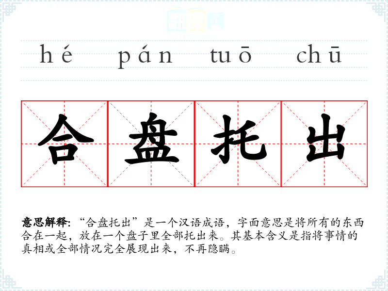 该成语的来源并不是非常明确,没有特定的历史典故或文学出处。但可以推测,它可能来源于古代的饮食文化,合盘表示将食物集中在一起,托出则意味着展示出来,反映了透明和公开的概念。