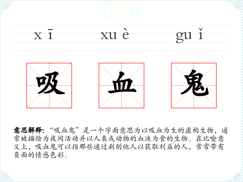 “吸血鬼”是一个字面意思为以吸血为生的虚构生物,通常被描绘为夜间活动并以人类或动物的血液为食的生物。在比喻意义上,吸血鬼可以指那些通过剥削他人以获取利益的人,常常带有负面的情感色彩。