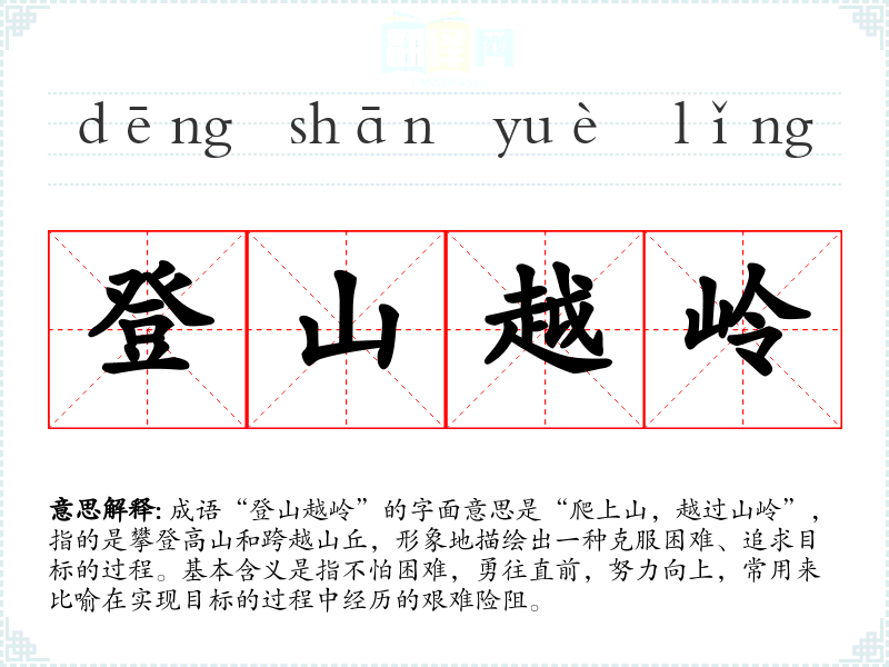 成语“登山越岭”的字面意思是“爬上山,越过山岭”,指的是攀登高山和跨越山丘,形象地描绘出一种克服困难、追求目标的过程。基本含义是指不怕困难,勇往直前,努力向上,常用来比喻在实现目标的过程中经历的艰难险阻。