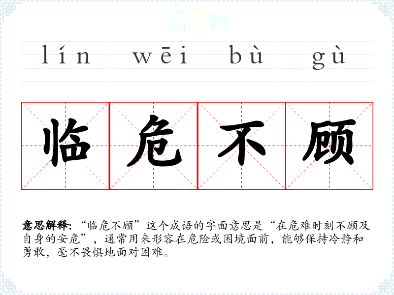 | 临危不顾 | 临:遇到;危:危险。遇到危难的时候,一点也不怕。 |