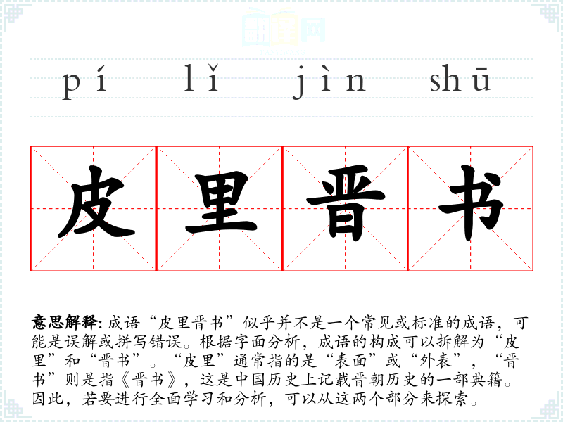 “皮里晋书”可以理解为表面上看似很有文化或学问,实际上却可能不够深刻的意思。字面上可以解读为“在表面上引用《晋书》”,暗示一种表面的知识或修饰。