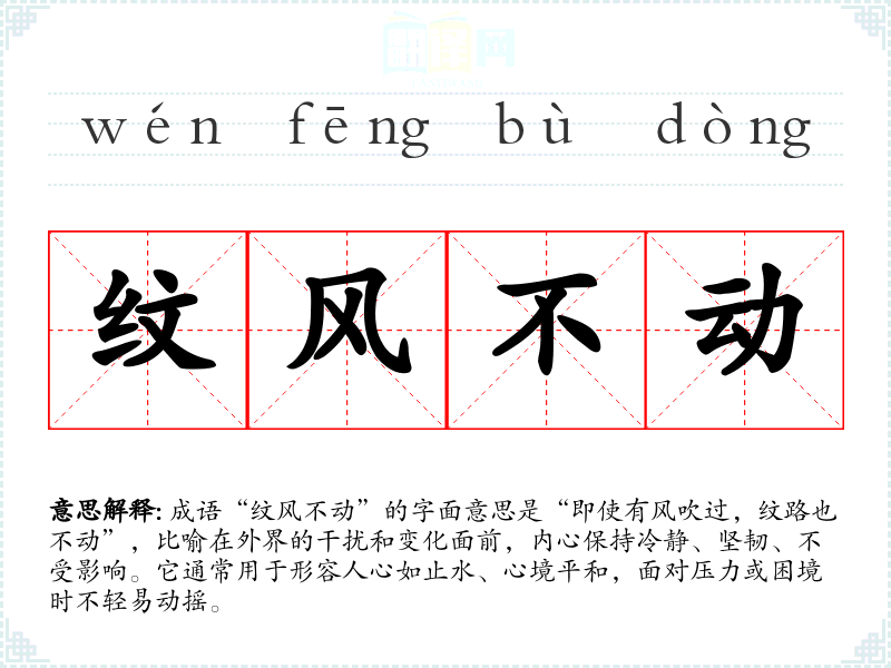 成语“纹风不动”的字面意思是“即使有风吹过,纹路也不动”,比喻在外界的干扰和变化面前,内心保持冷静、坚韧、不受影响。它通常用于形容人心如止水、心境平和,面对压力或困境时不轻易动摇。
