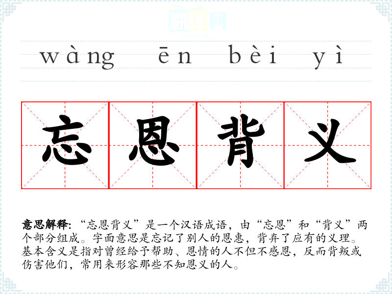 “忘恩背义”是一个汉语成语,由“忘恩”和“背义”两个部分组成。字面意思是忘记了别人的恩惠,背弃了应有的义理。基本含义是指对曾经给予帮助、恩情的人不但不感恩,反而背叛或伤害他们,常用来形容那些不知恩义的人。