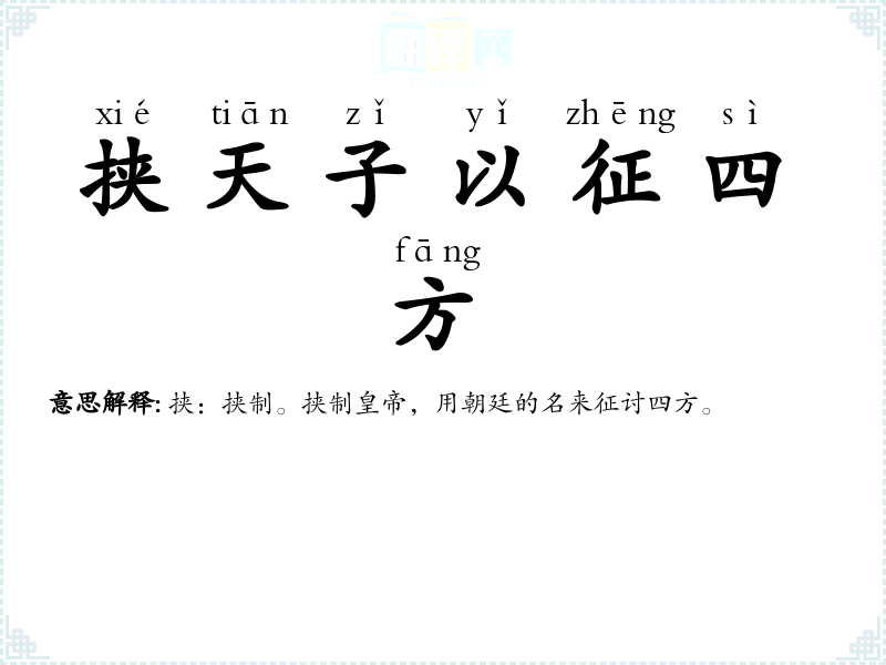 挟:挟制。挟制皇帝,用朝廷的名来征讨四方。 |