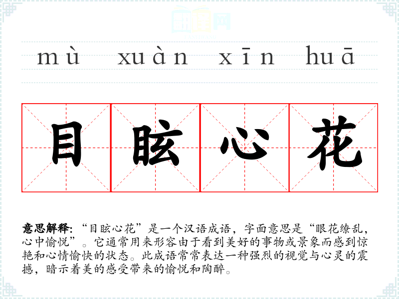 | 目眩心花 | 眩:眼花;花:模糊不清。眼花缭乱,心神迷乱。 |