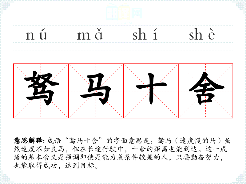 成语“驽马十舍”的字面意思是:驽马(速度慢的马)虽然速度不如良马,但在长途行驶中,十舍的距离也能到达。这一成语的基本含义是强调即使是能力或条件较差的人,只要勤奋努力,也能取得成功,达到目标。