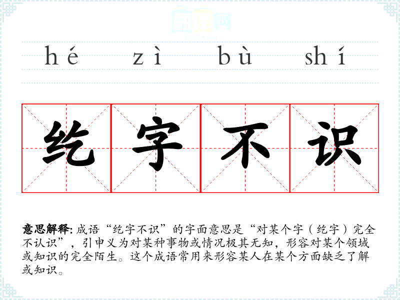 成语“纥字不识”的字面意思是“对某个字(纥字)完全不认识”,引申义为对某种事物或情况极其无知,形容对某个领域或知识的完全陌生。这个成语常用来形容某人在某个方面缺乏了解或知识。