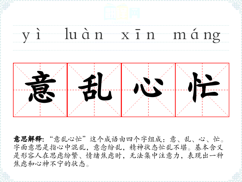 “意乱心忙”这个成语由四个字组成:意、乱、心、忙。字面意思是指心中混乱,意念纷乱,精神状态忙乱不堪。基本含义是形容人在思虑纷繁、情绪焦虑时,无法集中注意力,表现出一种焦虑和心神不宁的状态。