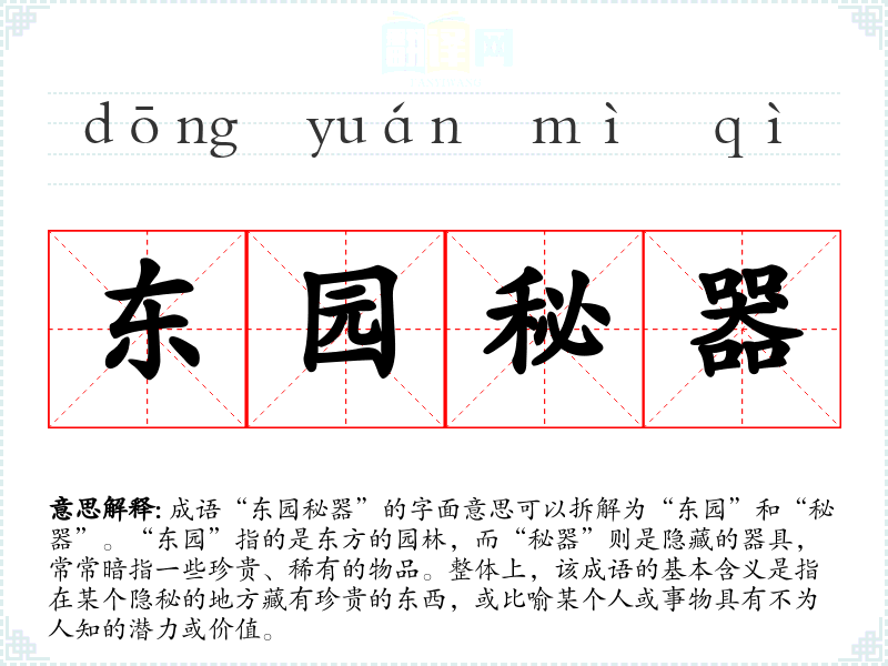 成语“东园秘器”的字面意思可以拆解为“东园”和“秘器”。“东园”指的是东方的园林,而“秘器”则是隐藏的器具,常常暗指一些珍贵、稀有的物品。整体上,该成语的基本含义是指在某个隐秘的地方藏有珍贵的东西,或比喻某个人或事物具有不为人知的潜力或价值。