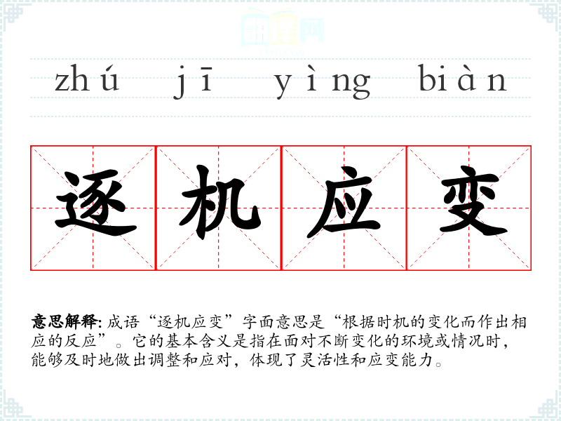 成语“逐机应变”字面意思是“根据时机的变化而作出相应的反应”。它的基本含义是指在面对不断变化的环境或情况时,能够及时地做出调整和应对,体现了灵活性和应变能力。