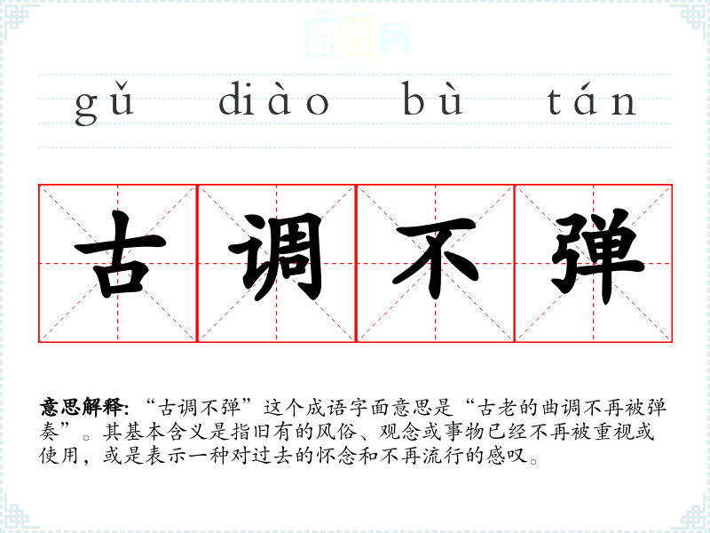 “古调不弹”这个成语字面意思是“古老的曲调不再被弹奏”。其基本含义是指旧有的风俗、观念或事物已经不再被重视或使用,或是表示一种对过去的怀念和不再流行的感叹。