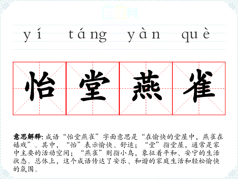 成语“怡堂燕雀”字面意思是“在愉快的堂屋中,燕雀在嬉戏”。其中,“怡”表示愉快、舒适;“堂”指堂屋,通常是家中主要的活动空间;“燕雀”则指**,象征着平和、安宁的生活状态。总体上,这个成语传达了安乐、和谐的家庭生活和轻松愉快的氛围。