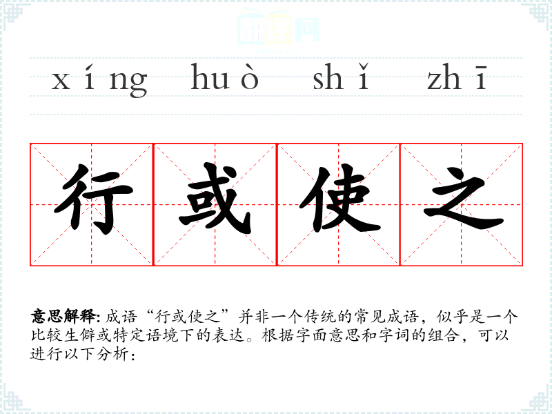 成语“行或使之”并非一个传统的常见成语,似乎是一个比较生僻或特定语境下的表达。根据字面意思和字词的组合,可以进行以下分析: