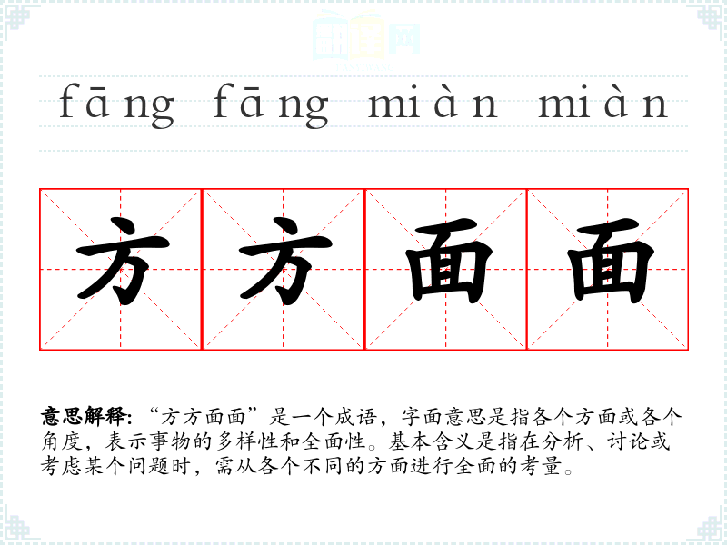 “方方面面”给人一种全面、细致的感觉。使用这个成语时,常常激发出对事物复杂性和多样性的尊重与理解,反映出一种务实的态度。