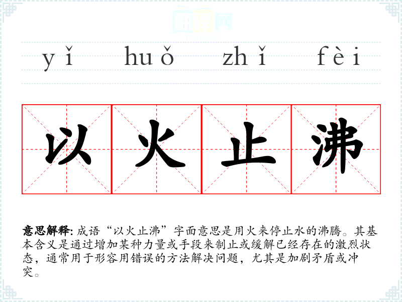 成语“以火止沸”字面意思是用火来停止水的沸腾。其基本含义是通过增加某种力量或手段来制止或缓解已经存在的激烈状态,通常用于形容用错误的方法解决问题,尤其是加剧矛盾或冲突。