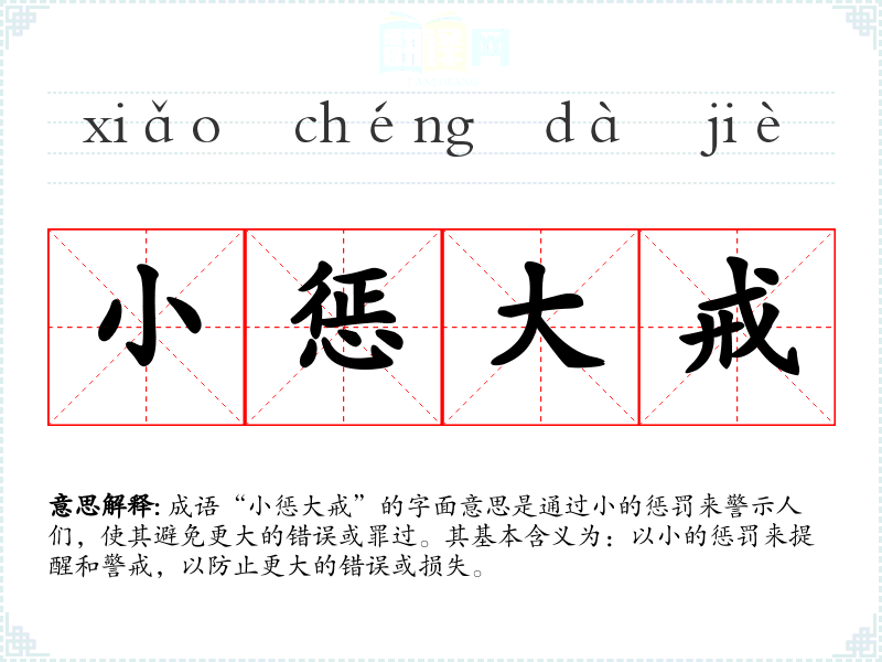 成语“小惩大戒”的字面意思是通过小的惩罚来警示人们,使其避免更大的错误或罪过。其基本含义为:以小的惩罚来提醒和警戒,以防止更大的错误或损失。