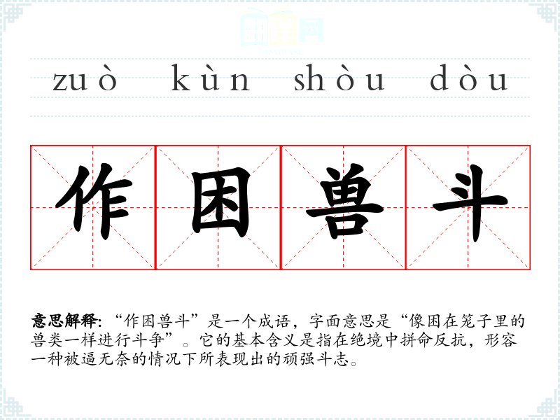“作困兽斗”是一个成语,字面意思是“像困在笼子里的兽类一样进行斗争”。它的基本含义是指在绝境中拼命反抗,形容一种被逼无奈的情况下所表现出的顽强斗志。
