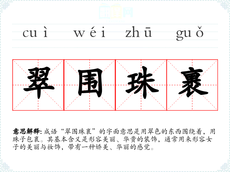 成语“翠围珠裹”的字面意思是用翠色的东西围绕着,用珠子包裹。其基本含义是形容美丽、华贵的装饰,通常用来形容女子的美丽与妆饰,带有一种娇美、华丽的感觉。