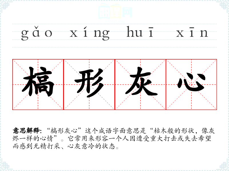 “槁形灰心”这个成语字面意思是“枯木般的形状,像灰烬一样的心情”。它常用来形容一个人因遭受重大打击或失去希望而感到无精打采、心灰意冷的状态。