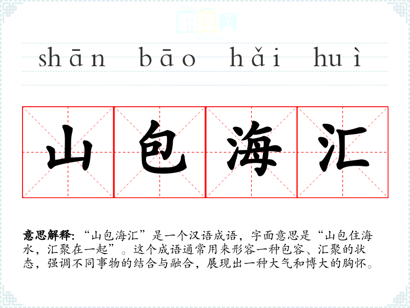 “山包海汇”是一个汉语成语,字面意思是“山包住海水,汇聚在一起”。这个成语通常用来形容一种包容、汇聚的状态,强调不同事物的结合与融合,展现出一种大气和博大的胸怀。
