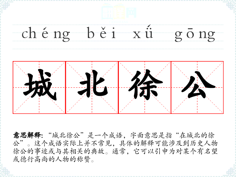 “城北徐公”是一个成语,字面意思是指“在城北的徐公”。这个成语实际上并不常见,具体的解释可能涉及到历史人物徐公的事迹或与其相关的典故。通常,它可以引申为对某个有名望或德行高尚的人物的称赞。